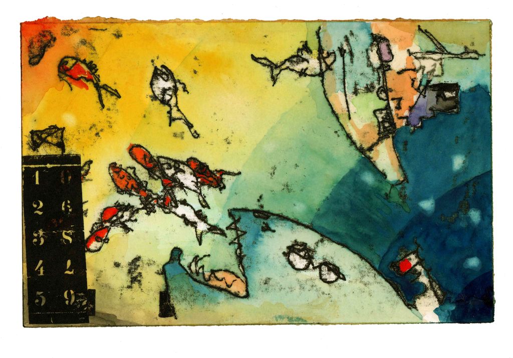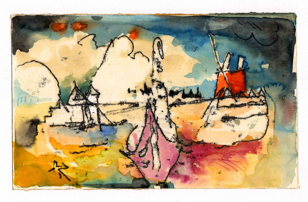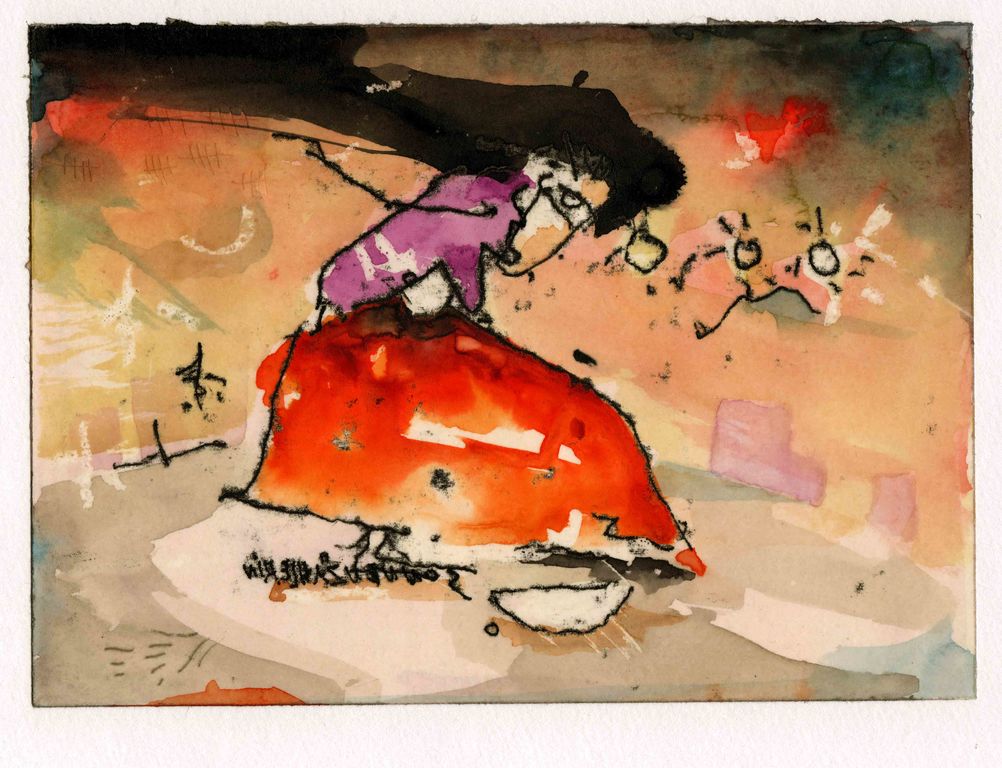 Mit dieser Technik entstehen recht schnell eine große Anzahl anspruchsvoller Arbeiten. Diese Art zu zeichnen und zu malen lässt sich ohne große Umstände Zuhause weiterführen. Grundlagenvermittlung in Monotypie und Aquarell sowie Formenlehre und Bildaufbau sind selbstverständlicher Bestandteil dieser kreativen Tage.