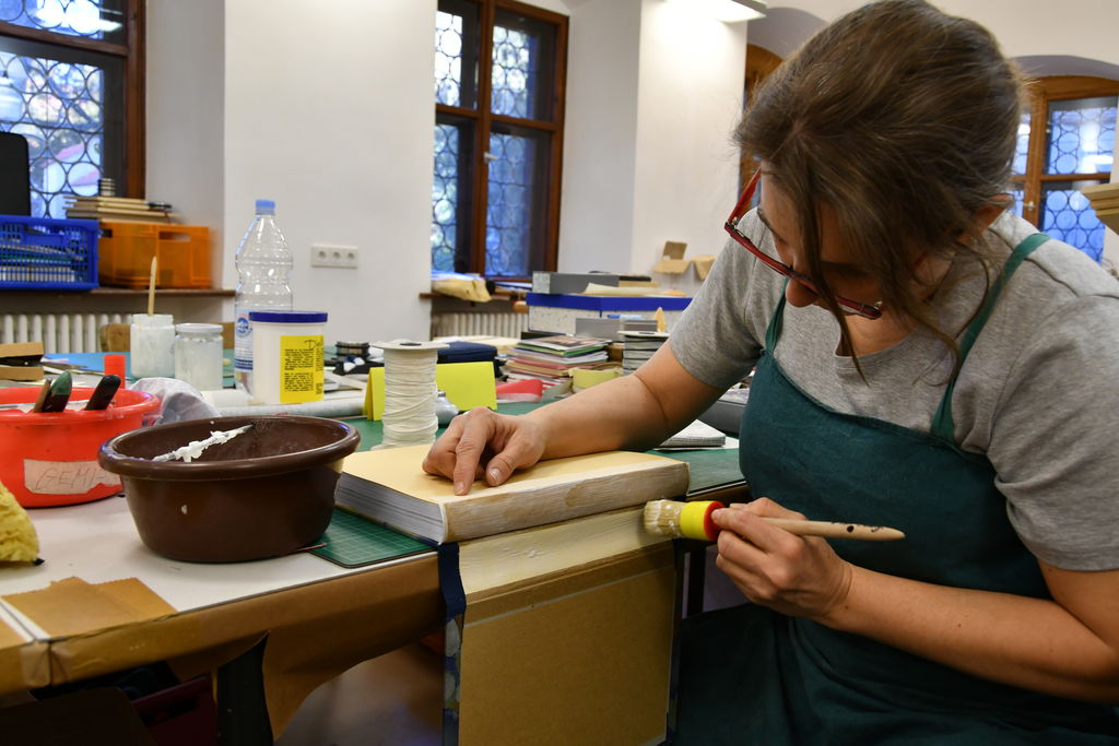 Erlernt werden die Reparatur von Einbanddecken, der Austausch von Vorsätzen, das Zerlegen, Flicken und Wiederherstellen von Buchblöcken unter Verwendung diverser Kleb- und Hilfsstoffe, sowie Methoden zum Einfärben verschiedener Ergänzungsmaterialien wie Leder, Gewebe und Papier. Aber auch Beschädigungen an den zugehörigen Schubern, Schachteln oder Kassetten setzen Know-how und den Umgang mit diversen Materialien voraus.